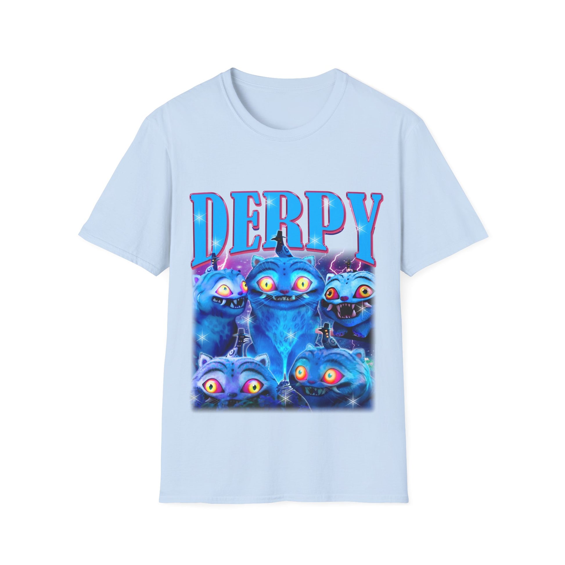 Bright, playful, and unapologetically silly — this tee wears its humor loud and proud. A cascade of wide-eyed, grinning cat faces in neon blues fills the front, topped with bold, bubbly lettering that reads “DERPY.” The artwork has a slightly retro, poster-like vibe with saturated colors that pop against the clean white fabric. Lightweight and soft, this shirt sits casual and comfortable on the body, ready for lazy weekends, late-night hangouts, or coffee runs where you want to make people smile. It’s for those who enjoy a little absurdity in their day and don’t take themselves too seriously. Wear it at meetups, game nights, conventions, or just around town when you want a conversation-starter that leans into goofy charm.