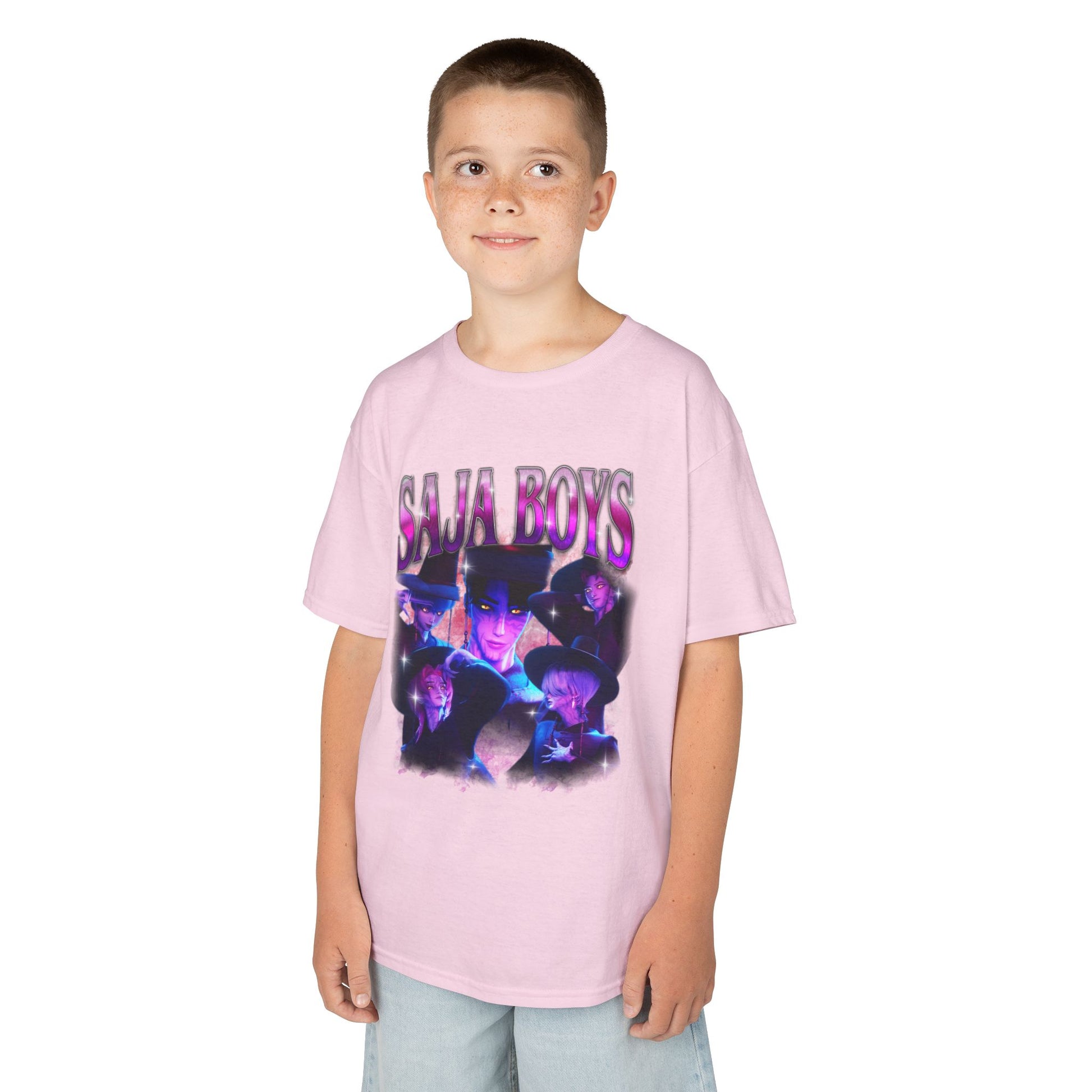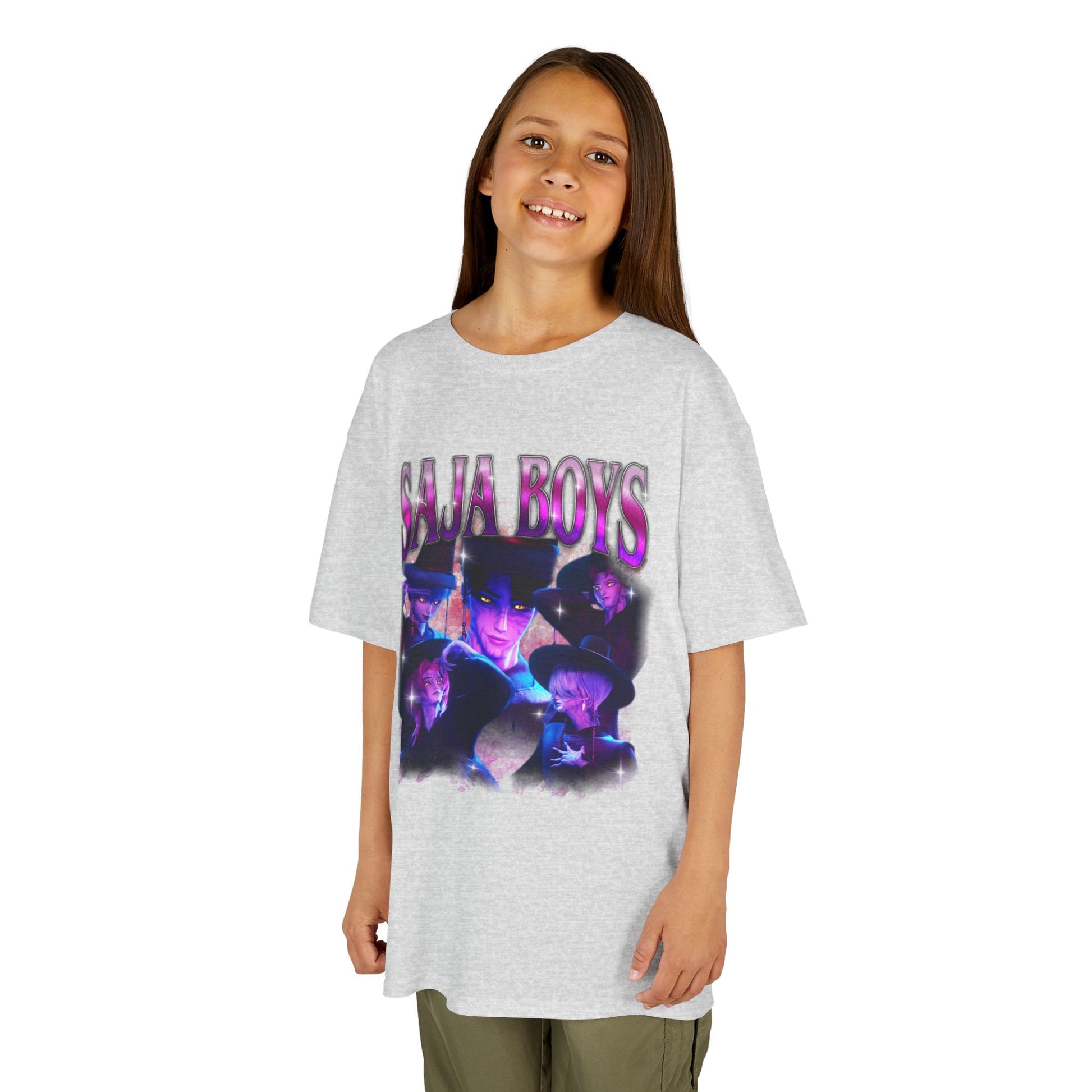 This soft midweight kids tee carries a nostalgic, fan-club energy — a compact canvas for bold, neon-style artwork that reads “SAJA BOYS” across the chest. The graphic’s purple and blue glow feels like late-night video chats, concert lights, and sticker-covered sketchbooks. It sits comfortably on active days: roomy enough for play, simple enough to layer under a zip hoodie, and eye-catching enough to make a kid feel like they belong to a crew. The shirt breathes, stretches with movement, and keeps its shape so the design stays front-and-center through washes and wear.